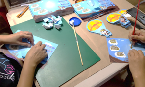 The artwork is printed on heavy paper. These sheets are then sent to a die-cutting machine, which punches out each piece like a cookie cutter. Then, the pieces are grouped and sent to an assembly line to be put together by skilled workers.